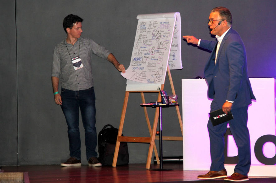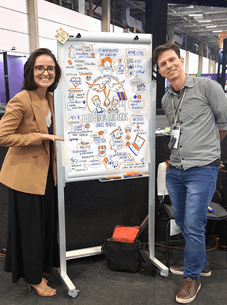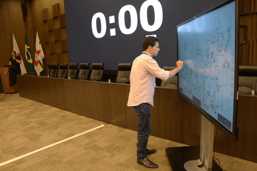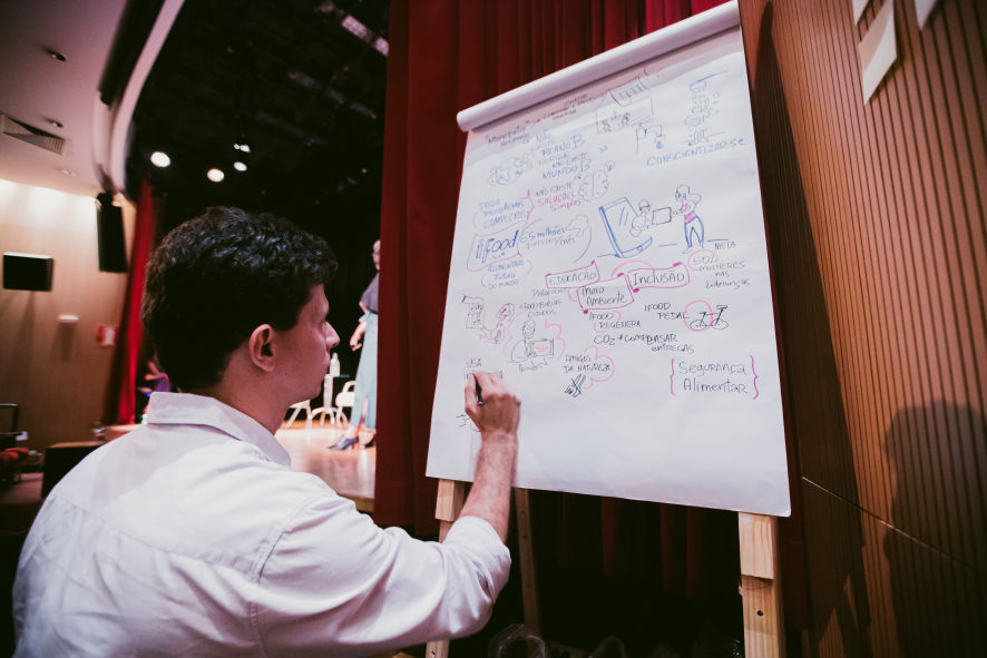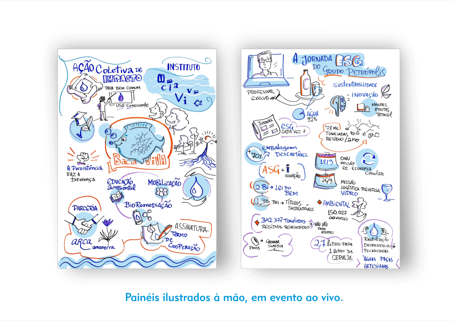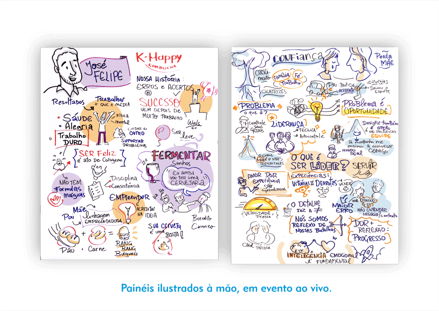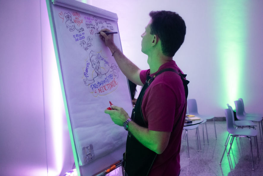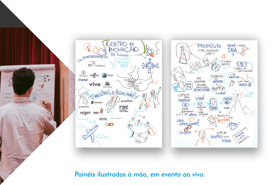 O resultado são composições visuais atrativas e didáticas feitas em grandes cartolinas, flip chart ou tablet, à critério do cliente, para projeção ao final.