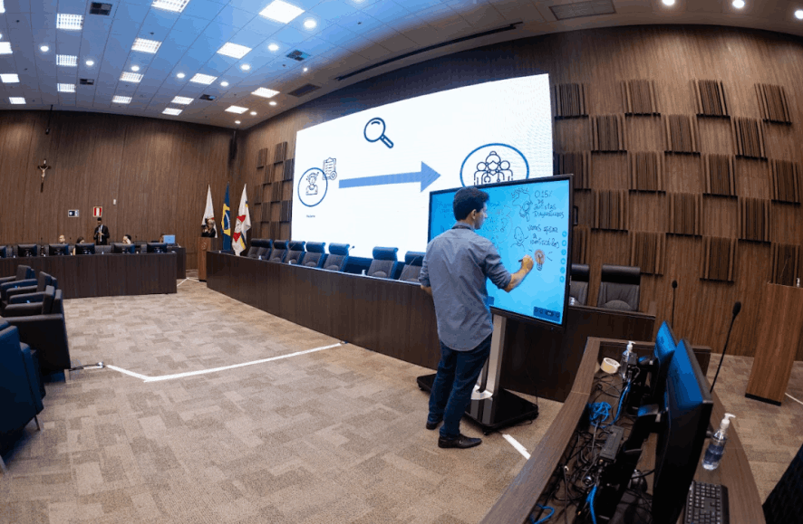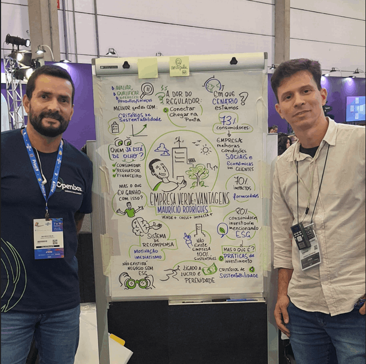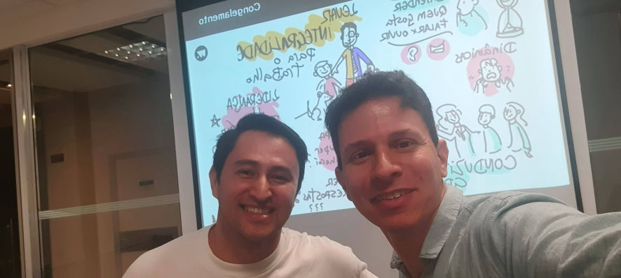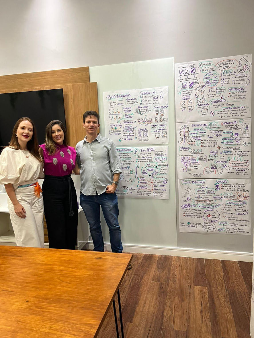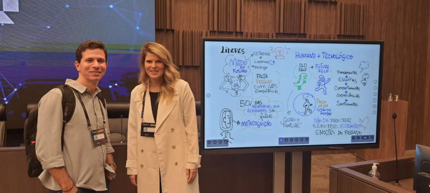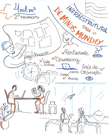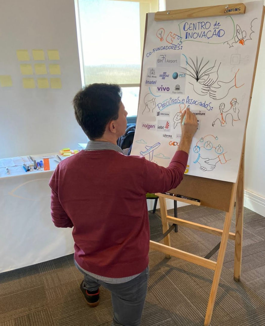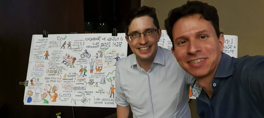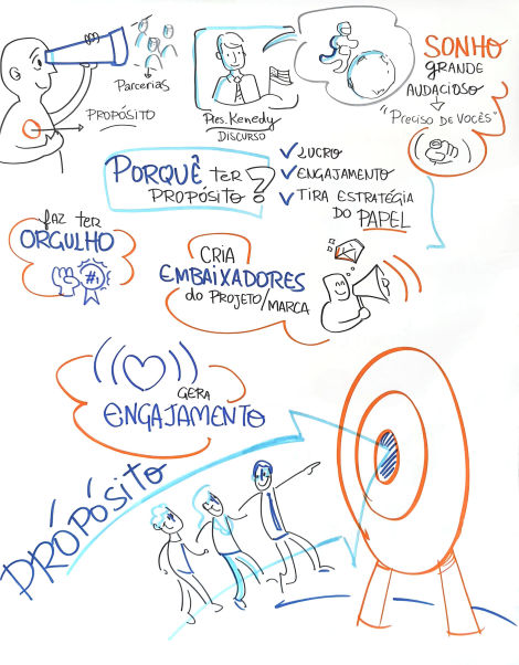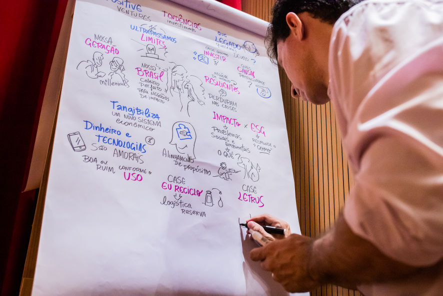 O resultado são composições visuais atrativas e didáticas feitas em grandes cartolinas, flip chart ou tablet, à critério do cliente, para projeção ao final.