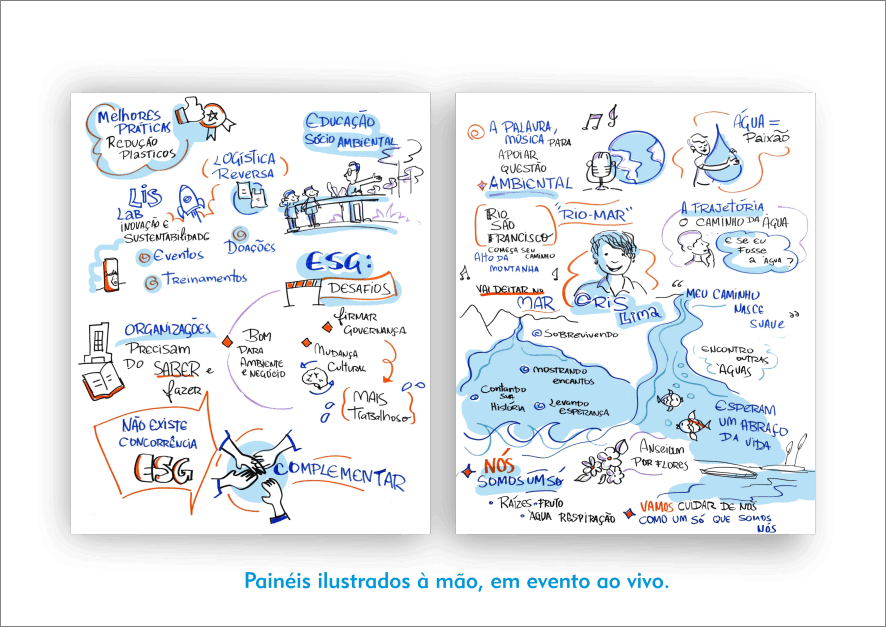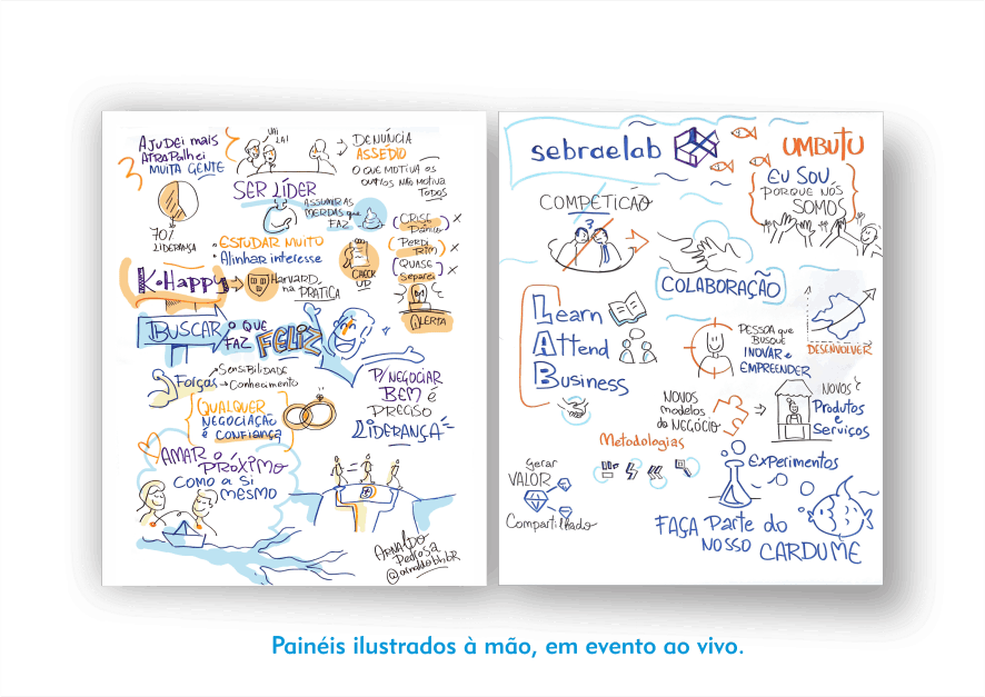 Elaboro painéis ilustrados registrando o conteúdo de eventos presenciais e online e também de reuniões corporativas; workshops; aulas; lives, etc